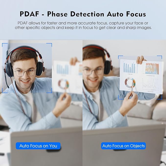- 【Advanced PDAF Auto-Focus】Phase Detection Auto Focus, allows for more faster and precise auto focus, captures your face or the other specific objects when you close to the camera, and always keep you in focus to get clear and sharp images, great feature for live-streaming and video calling.