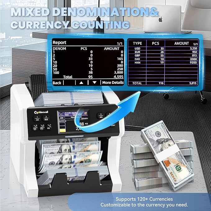 - Boost Your Efficiency: NEW Upgraded Bill counter machine mixed denomination counts and reports total value, clear breakdown of quantity and value by Denom, and serial number. The machine is low noise and durable. The user-friendly TFT touch screen with key buttons makes your cash counting job as easy as possible. The upgraded accessories makes the counting process smoother. Ideal for grocery stores or casinos to deal with heavy cash-counting jobs.