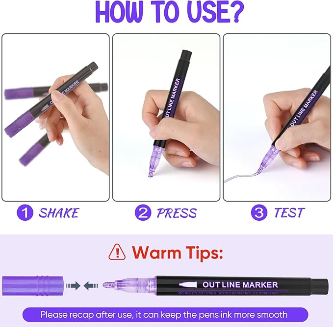- 🎨Glitter Metallic Markers: These glitter outline markers feature a glitter metallic finish, perfect for adding eye-catching accents and highlights to your artwork or designs