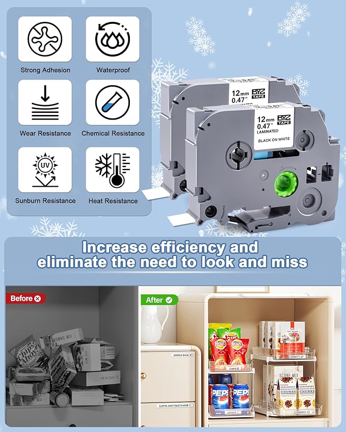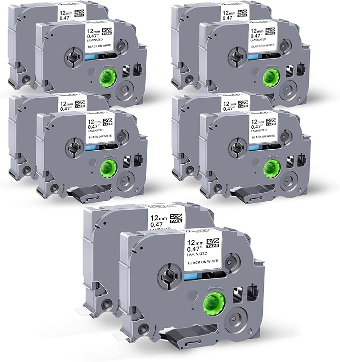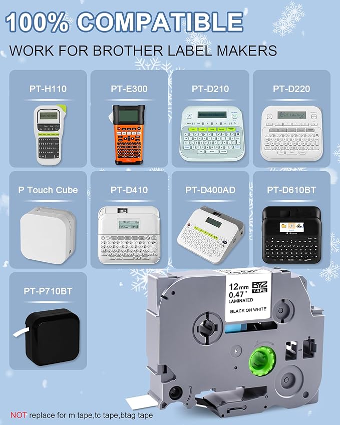 - Easy to Apply: The split back of Compatible with Brother tz tape is easy to remove, no sticky residue remains when the labels are removed, which makes the replacement label tape easy to peel and apply to multiple surfaces,keep the sticky side clean and dry before using 12mm.47 laminated white tz tape,the label will work