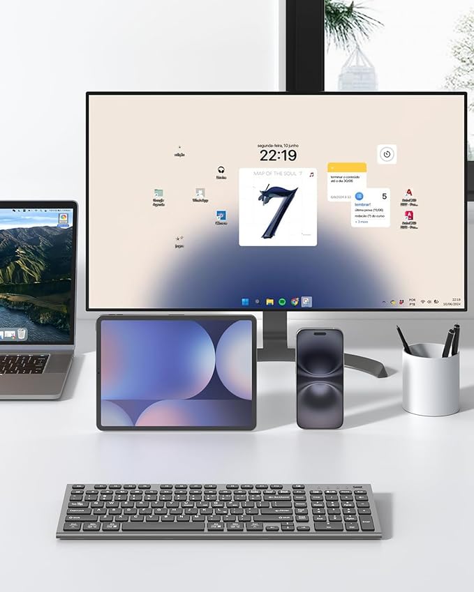 - Special Feature : 3 Bluetooth + 2.4G USB for multi devices, Compact full-size 121 keys 10% shorter, Compatible with Android/iOS/macOS/Windows systems, Ergonomic Silent Slim, Rechargeable USB C 3 Bluetooth + 2.4G USB for multi devices, Compact full-size 121 keys 10% shorter, Compatible with Android/iOS/macOS/Windows systems, Ergonom… See more