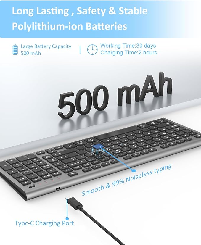 - 【Environmental Protection and Energy Saving】:Never worry about running out of power again! Our high-capacity long-lasting rechargeable battery. The battery capacity is about twice that of most standard wireless keyboards.No more tossing out disposable batteries; it’s eco-friendly and cost-saving. Type C charging port, charging takes about 1.5 hours, with a usage time to about 60 days (depending on usage habits). The smart low-battery reminder ensures you’re always prepared, whether you’re working on a cross-country flight or a long study session.