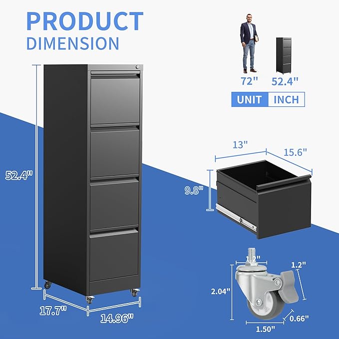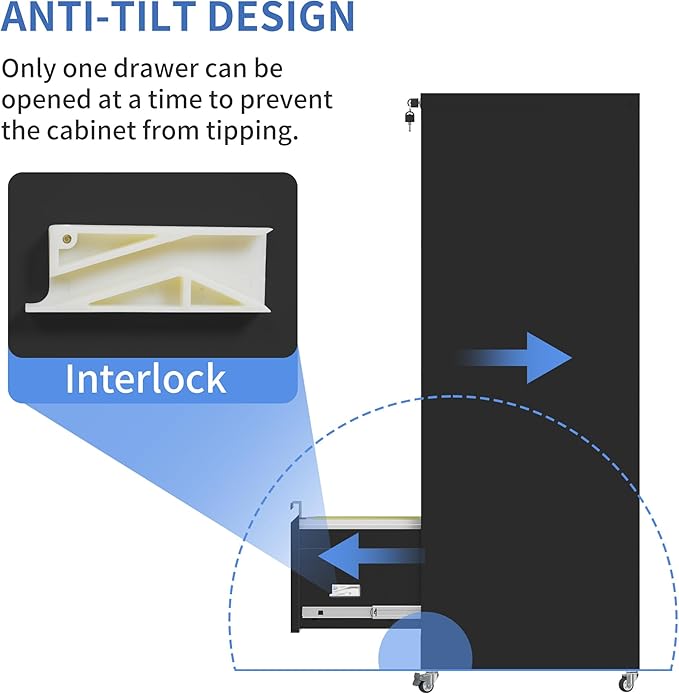 - 【Rolling Fill Cabinet】This 4 drawer file cabinet equipped with 2 lockable casters, 2 x 360° swivel casters and1x anti-tilt wheel. The anti-tilt caster to prevent tipping over. You can easily move the cabinet with wheels, making it easy for you to move to another place.