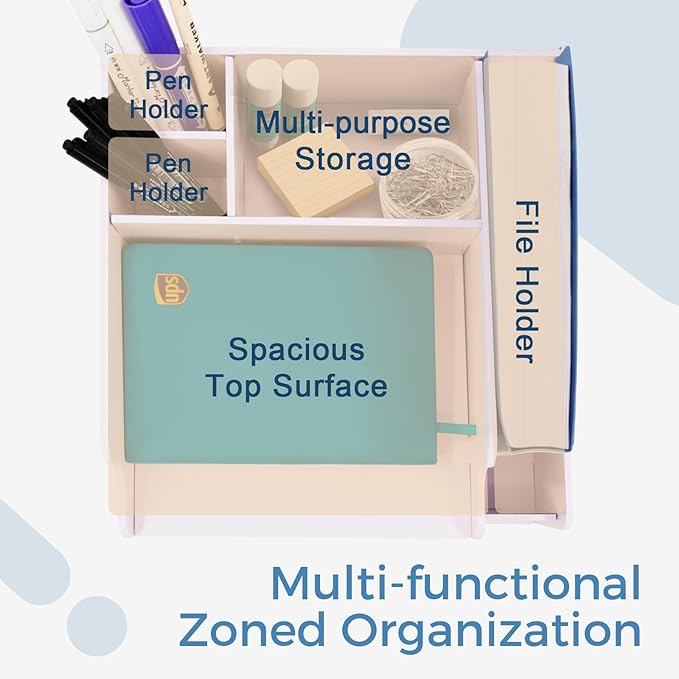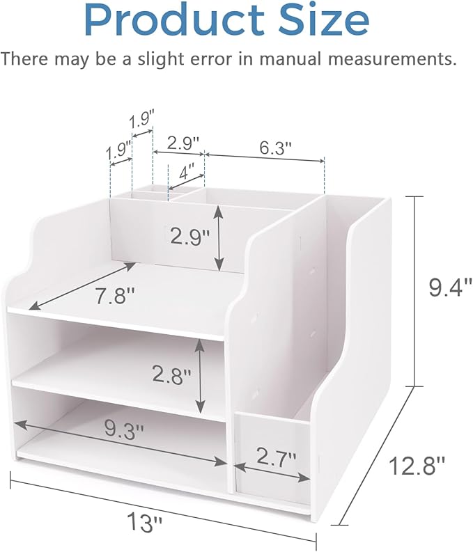 - SUITABLE SIZE: The assembled desk organizer measures approximately 13"W × 12.8"D × 9.4"H. Features 2 horizontal compartments (9.3"W × 12.2"D × 2.8"H) for documents and 1 vertical file holder (2.7"W × 12.2"D × 9.4"H). The top surface includes 2 pen holders and a multi-purpose storage box. This all-in-one design desktop file organizer efficiently organizes documents, stationery, and office accessories while keeping your workspace tidy