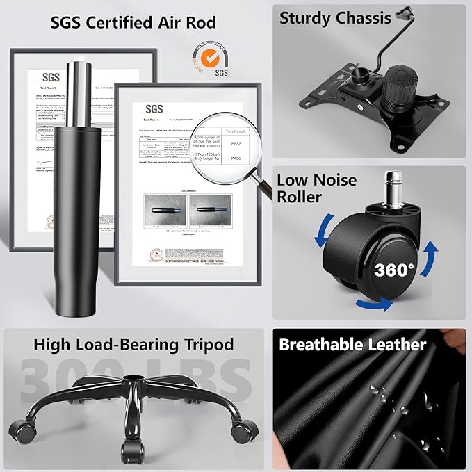 - Sturdy & Durable:Heavy-duty metal base supports up to 300 lbs. Reinforced with SGS-certified Grade 3 gas lift and 360° silent swivel casters for stability and smooth mobility. Explosion-proof base ensures long-lasting reliability.