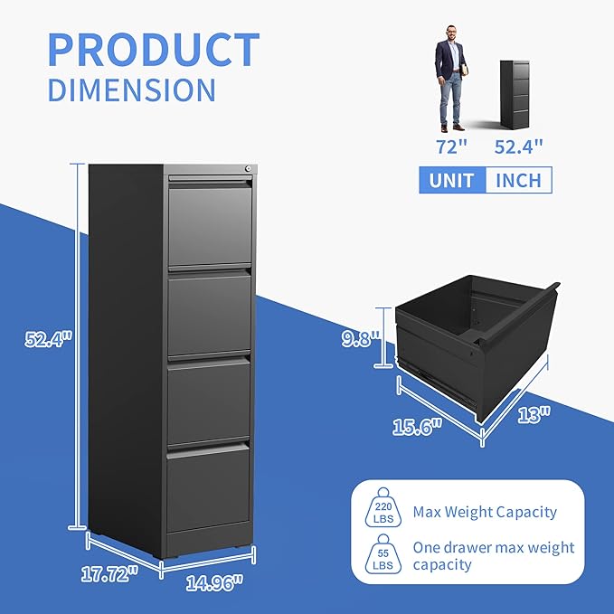 - 【Sturdy and Durable】This file cabinet crafted from steel material, designed to be durable and suitable for all your storage needs. With a powder coating process that bonds and bakes the protective coating to the bare metal, the filing cabinet forms an effective barrier against corrosion. You can rest assured that this 4 drawer file cabinet will remain in great condition for several years to come.