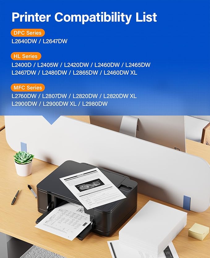 - To use with: Compatible for Brother HL-L2400D, HL-L2405W, HL-L2420DW, HL-L2460DW, HL-L2465DW, HL-L2467DW, HL-L2480DW, HL-L2865DW, HL-L2460DW XL, MFC-L2760DW, MFC-L2807DW, MFC-L2820DW, MFC-L2820DW XL, MFC-L2900DW, MFC-L2900DW XL, MFC-L2980DW, DCP-L2640DW, DCP-L2647DW Laser Printer.