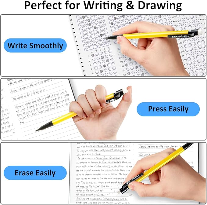 - Ene Eraser with Mechanical Pencil - Each lead pencil comes with an end eraser on the click button, you can erase pencil marks easily and cleanly, and it’s durable enough for normal use