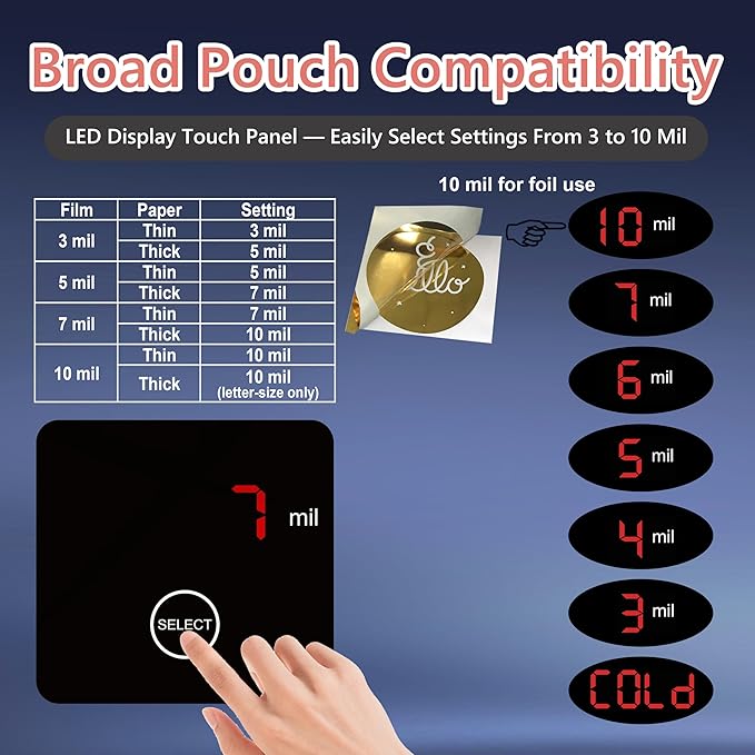 - 【LED Display Touch Panel】Easily select the appropriate setting based on pouch thickness with a simple, beginner-friendly one-touch control. Setting recommendations according to sheet and paper thickness are clearly printed on the machine for quick reference and ease of use.