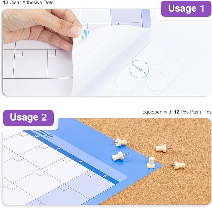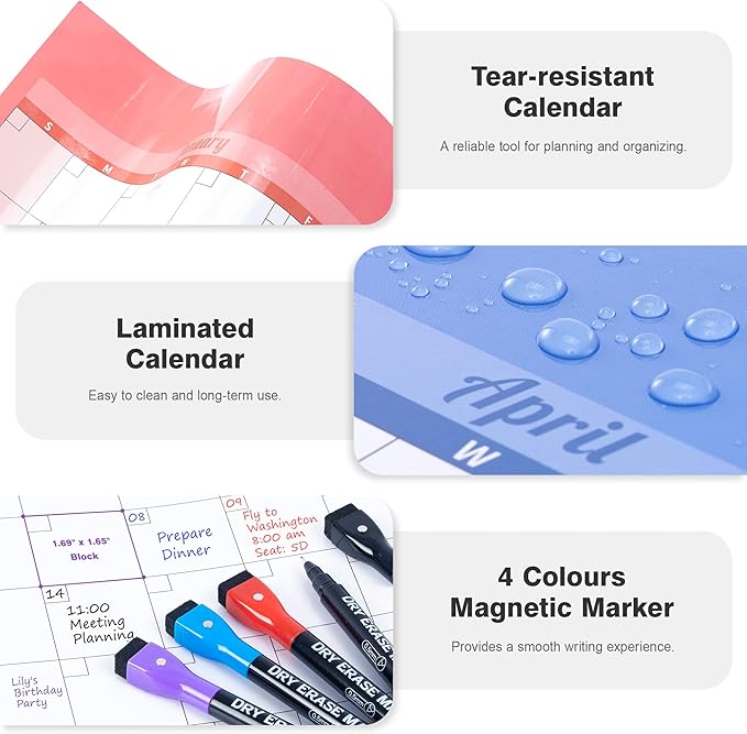 - ✨ Undated Laminated Calendar: This waterproof wall calendar comes with a mini eraser, four dry-erase markers, 10 push pins, and 10 transparent round stickers. The undated monthly calendar can be started at any time, making it perfect for long-term use.