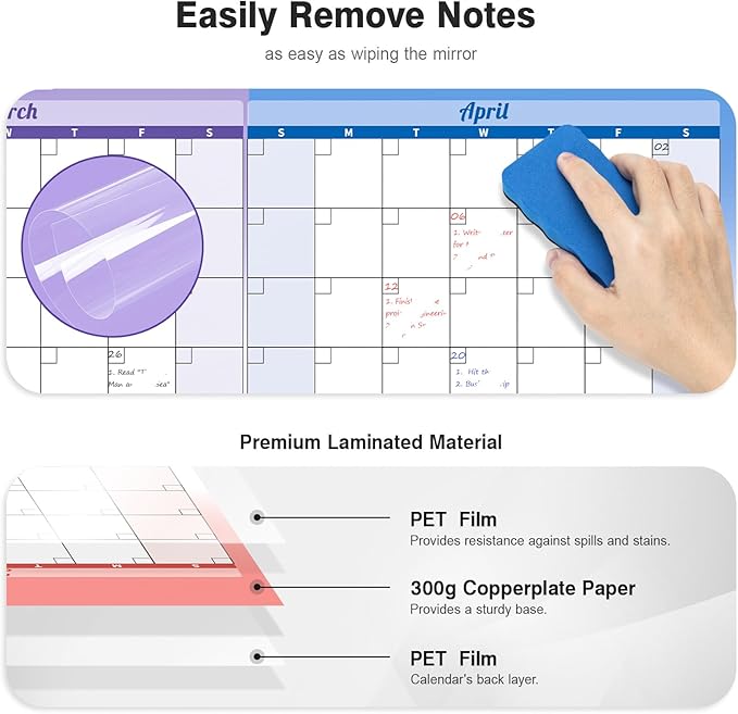 - ✨ Dry Erase Wall Calendar : is made of PET Film and 300 grams Copperplate Paper, providing a durable surface that resists scratches and smudges, while the sturdy Copperplate Paper backing keeps it in place without curling.