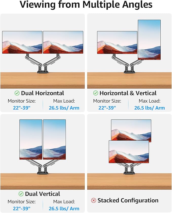 - Supports Serious Screens - The monitor arm handles monitors up to 26.5 lbs and fits screen sizes from 22" to 39", with VESA 75x75mm and 100x100mm compatibility. Whether it’s an ultra-wide for spreadsheets or a 4K display for gaming, this dual monitor mount lifts with ease and stays rock-solid.
