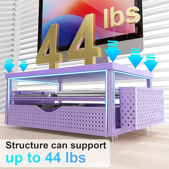 - 【Organized Storage】This desk monitor stand/organizer features two tiers of storage for files and notes. Equipped with two pen holders and a drawer , it effortlessly organizes pens, scissors, and other desk essentials, keeping everything within reach.