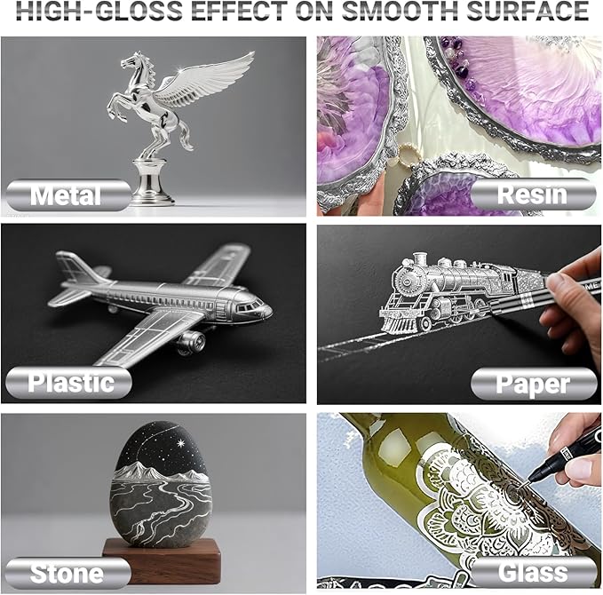 - Wide Application: High gloss reflective touch up metallic markers can be created on most smooth surfaces (such as plastic, glass,metal, rock painting, paper, canvas, ceramic) Perfect for arts and crafts, model paints for plastic models scratch repair, DIY projects, Easter eggs, card making, Christmas cards, cars steering wheel logo, etc. For the best mirror-effect, please apply it on a smooth and non-absorbent surface.