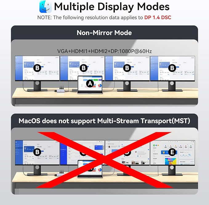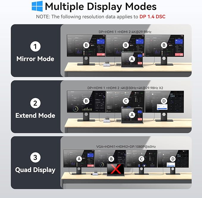 - Laptop Docking Station 4K Display Adapter: The Docking Station for dell laptop with 4 video output ports: 2 HDMI+DP+VGA, can output up to 4K Dual/Triple Display videos; For quadruple display Dual HDMI, DP, and VGA all are 1080@60Hz. Please make sure your laptop specification support DP1.4 signal output. If the VGA port is connected, it will affect the resolution of all displays up to 1080P only