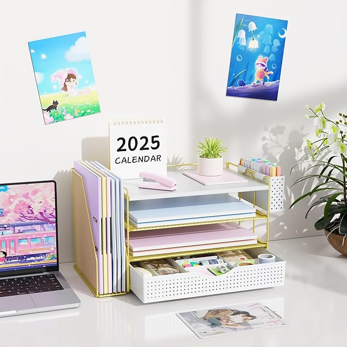 Wood Desk Organizers and Accessories with File Holder, 4-Tier Desk Accessories & Workspace Organizers with Drawer and Pen Holder, Paper Organizer for Office Supplies (Gold)