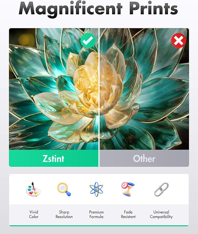 - The latest chip version: Zstint the Ink Cartridges is equipped with the latest upgraded version of the chip, ensuring perfect compatibility with each Ink Cartridges and quick recognition of the printer, allowing you to enjoy efficient and worry-free printing. Our Ink Cartridges have passed ISO9001 certification. High-quality Ink Cartridges meet the demands of high print volumes. Fine ink ensures clear and stain-free printing results and extends the service life of the printer. The printing effect is stable and reliable. You can install and replace it directly without manual adjustment.