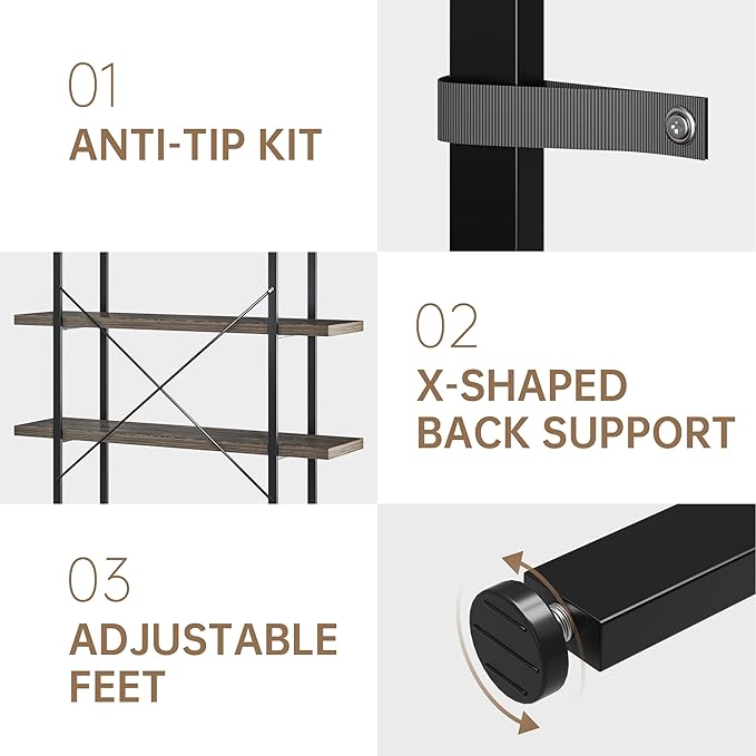 - Stable and Durable: Our four-tier industrial bookshelf is capable of holding heavy items securely. The matte black steel frame includes X-shaped support, adjustable feet, and two anti-tip devices, ensuring enhanced stability and durability
