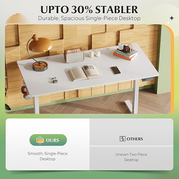 - Seamless One-Piece Desktop: Our stand up desk features a smooth, one-piece desk surface without visible seams. Unlike other models with joined panels, this seamless design offers 30% enhanced stability to provide a solid foundation for your equipment.