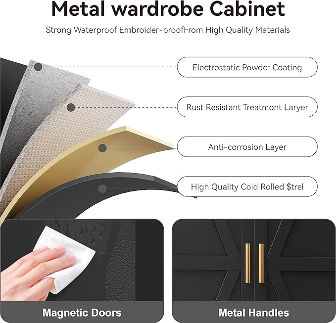- Easy Assembly:With simple step-by-step instructions and labeled parts, this metal armoire unit is a breeze to assemble. Wipe clean with a dry cloth for maintenance. If you have any questions about our wardrobe or their operation procedures, please contact us