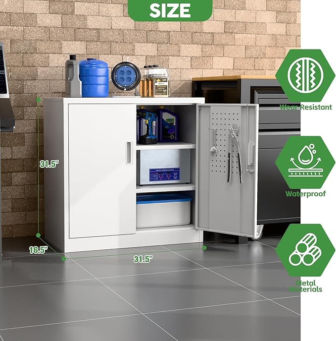 Aobabo 31.5" H Small Garage Storage Cabinet with Pegboard,Lockable File Storage Cabinet with 2 Adjustable Shelves for Garage, Office, School, Assembly Require, White