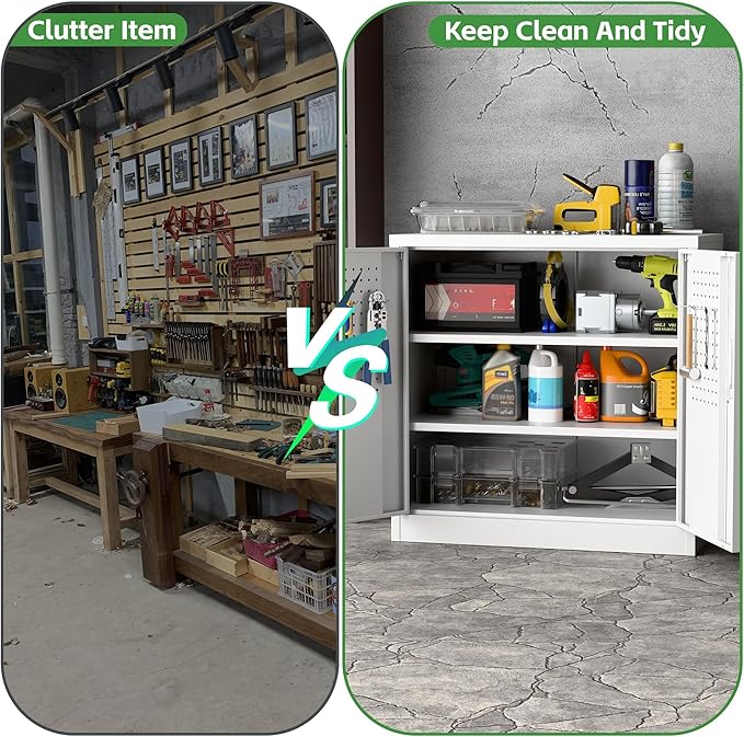 - Redesigned for Efficiency: Integrated Pegboard Doors + Free Hooks! "NEW UPGRADE: Double doors feature full pegboard panels and include four heavy-duty hooks. Instantly hang tools, cords, or accessories – maximizing every inch of space for a super-organized, ultra-convenient workspace."