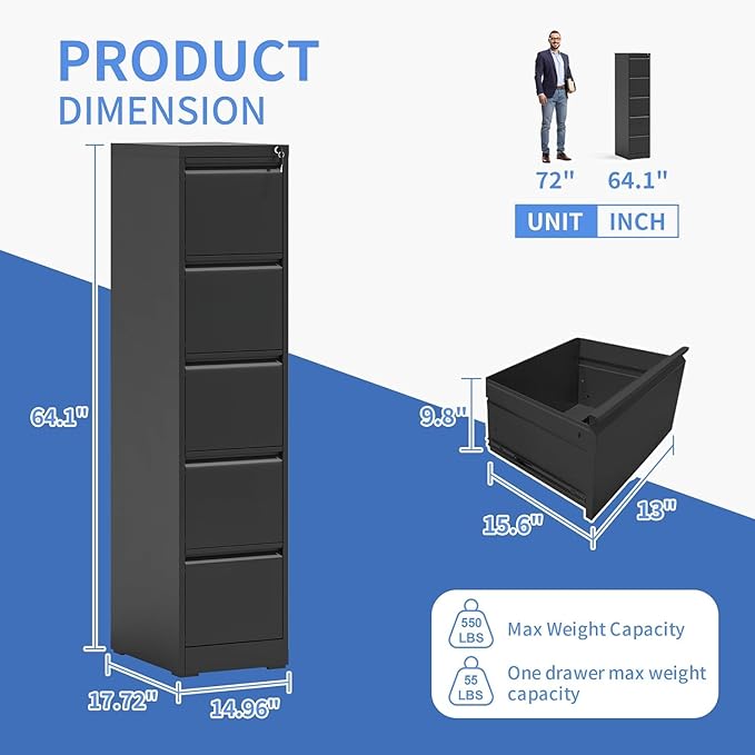 - 【Sturdy and Durable】This file cabinet crafted from steel material, designed to be durable and suitable for all your storage needs. With a powder coating process that bonds and bakes the protective coating to the bare metal, the filing cabinet forms an effective barrier against corrosion. You can rest assured that this 5 drawer file cabinet will remain in great condition for several years to come.