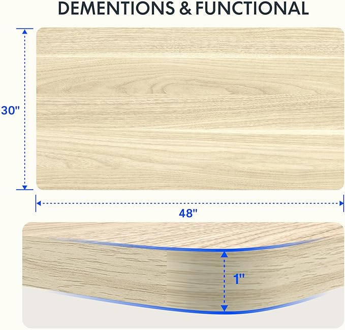 - AMPLE WHOLE-PIECE DESKTOP: With its whole-piece 1” eco-friendly desktop, this standing desk provides plenty of room for your computer setup, documents, and accessories, creating a well-organized and productive work environment. Due to hand measurements, desktop dimensions may vary slightly by 0 to 2”.