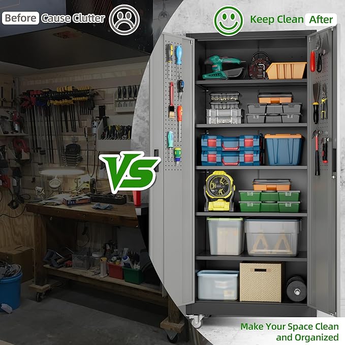 - [Garage Storage Cabinet] Plenty of storage. "great garage cleanup".You can move them around as needed and the casters and wheels work great on all the different surfaces inyour garage. Extra storage strong and fit your needs, it is sufficient for garage use.