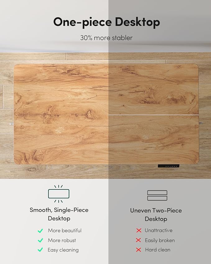 - Simplified Assembly: The Fezibo electric sit-stand desk includes detailed instructions for streamlined installation. One-piece desktop requires less steps than joined desktops to save time and effort. Please contact our support team if you have questions about assembly or product selection.