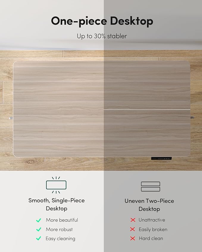 - Seamless One-Piece Design: Fezibo adjustable standing desk features a smooth, one-piece desk surface without visible seams. Unlike other models with joined panels, this seamless design offers 30% enhanced stability to provide a solid foundation for your equipment.